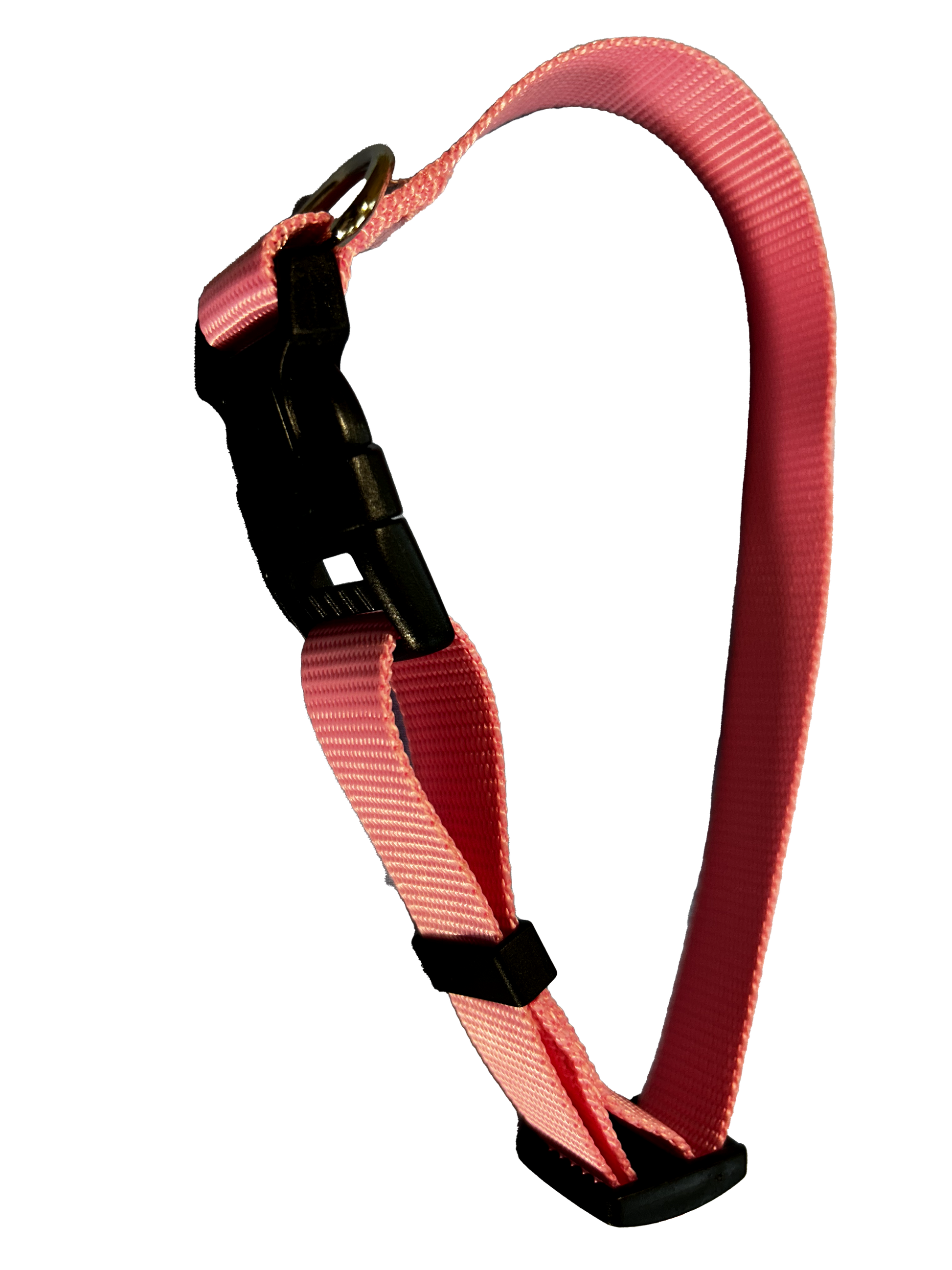 Our leashes are made with high quality nylon. The buckle is heavy duty plastic and the D ring is made with alloy metal.