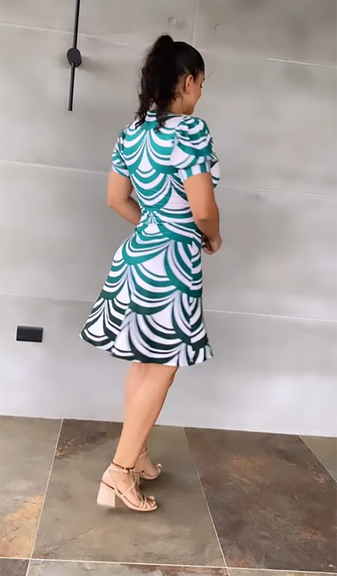 - Semi-puffed shoulder, Mid-thigh length, Front-tie down dress.