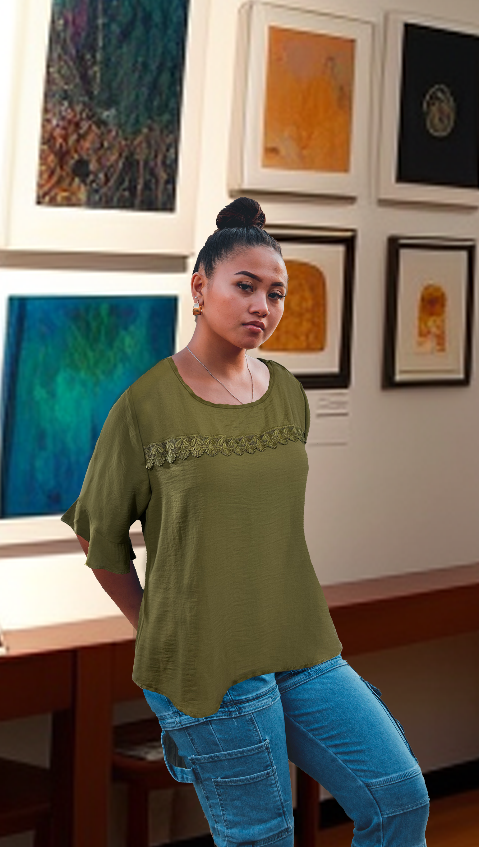 Size 12 blouse, quarter sleeve. Polyester and cotton. Description: · Light, comfortable and breathable fabric, perfect all year long. · Features 3/4 sleeve, round neck, straight hem. · Occasions: casual, daily, office, date, dinner, party, great match with your skinny, leggings, jeans and shorts, even skirts. · PLEASE refer to our size chart in our picture section.